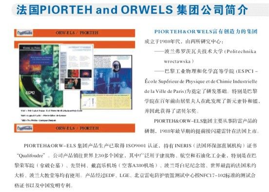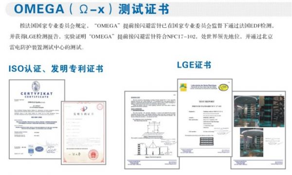 OMEGA:Ω-X提前放電避雷針由法國PIORTEH & WRWELS集團公司研制,公司已取得ISO9001認證,持有INERIS(法國環保直屬機構)證書,公司產品銷住世界30多個國家和地區,廣泛用于建筑物、航空、和石化企業,如:巴黎榮軍院(拿破侖墓)、先賢祠、戴高爾機場、波蘭哥白尼紀念館、世界最高的法國米約大橋、波蘭大教等名建筑中均有使用。產品已通過EDF、LGE、北京雷電防護裝置測試中心的檢測報告和中國發明專利,產品由太平洋保險公司承保。