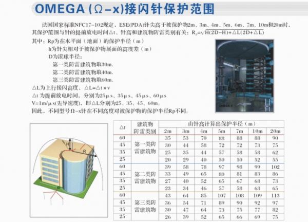 根據法國國家標準NFC17102規定,ESE(“提前接閃”的英文縮寫)針尖高于被保護物2m4m5m、6m、7m、10m20m時,其保護范圍與避雷針的提前放電時間T、針高和建筑物的防雷類別有關: