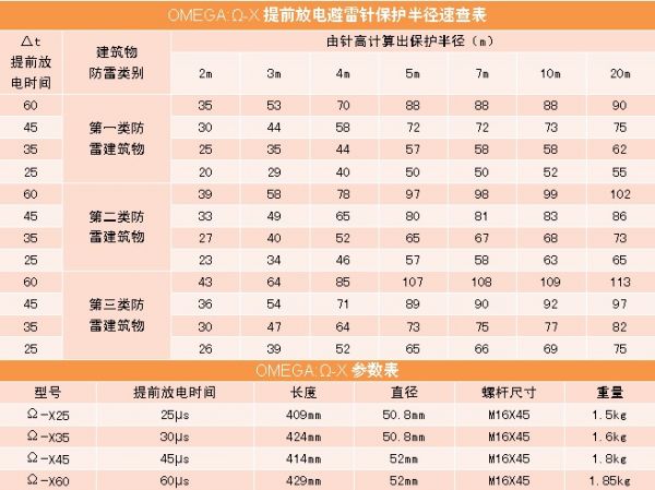 Ω-X避雷針技術參數: