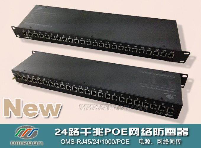 歐姆雷盾(omrdon)16路/24路千兆POE網絡防雷器(1000M POE網絡防雷器、千兆POE交換機防雷器) OMPS-RJ45/POE/1000/16/24,是依據IEC和GB標準設計和制造,同時滿足IEEE802.3AT要求,采用優質、高泄放電能力的電涌保護器件和超低結電容超快速恢復二極管矩陣結構、網絡濾波器等為數據線提供高能粗級保護和低能量的精細保護,適用于利用六類網線同時傳輸電源、網絡信號的服務器、無線AP、網絡攝像機、網絡交換機等通信設備的電涌保護,一體化集成設計,安裝方便。