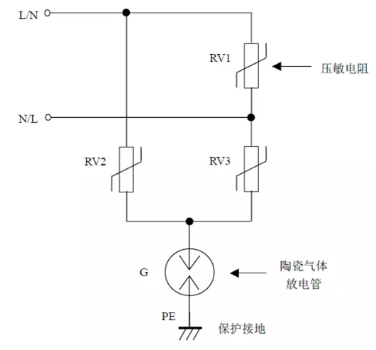 2.缺點:壓敏電阻RV1 短路失效后易引起火災。最好在每個壓敏電阻上串聯一個工頻保險絲以防壓敏電阻短路起火。如果L、N 線不可能接反,則可省去壓敏電阻RV2、RV3,將放電管G 的上端直接接到N 線上,構成“1+1”電路。