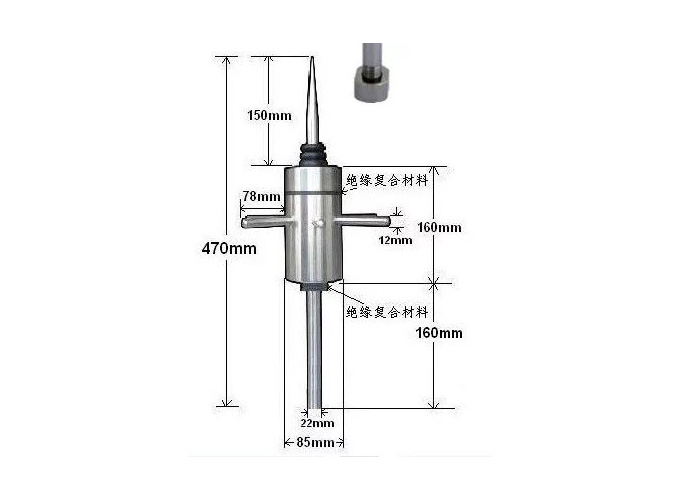 在雷電放電之前的高靜態電場特性情況下,OML-ESE/F3離子提前放電接閃器在針尖會產生可控幅度和頻率的脈沖,這使避雷針產生一個上行先導并向上傳播,從而截獲雷云里發出的下行先導,達到最先放電的目的。由于其特殊設計的電離過程使之能較其他鄰近高點提前產生上行先導,從而達到最先放電的目的。這個觸發時間的提前值,被稱為預放電時間△T。這是考核預放電型避雷針(ESE型避雷針)性能的主要指標。