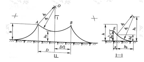 7)接閃線兩端的保護范圍按兩支高度hr的接閃桿確定,但在中線上h0線的內(nèi)移位置按以下方法確定(圖D.0.6-2的1-1剖面):以兩支高度hr的接閃桿所確定的保護范圍中點最低點的高度