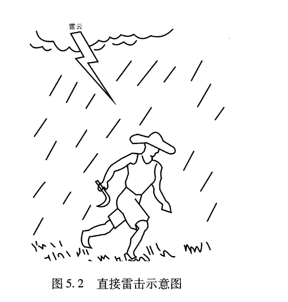當雷云對地放電時,凡在戶外工作,在建筑物項上施工,在曠野荒郊行走,在水面上作業或活動,在山上露營和探礦,甚至在建筑平臺觀景的人們,都有可能被閃電直接擊中。因為當閃電的先導放電通道端頭下串到地面物體上方大約20~30m時,在人體周圍沒有其他更高豎立導體的情況下,人體就會成為雷電襲擊的目標。這時人頭頂上空的電場強度驟增,于是從人頭頂便發出向上的回閃放電。當這種放電與雷云下行先導放電通道接通時,強大的雷電流便通過人體并經過兩腳人地了,如圖5.2所示。這樣就是所謂的人體遭受到直接雷擊。