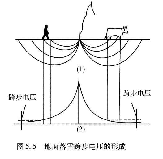 當地面落雷或避雷裝置的引下線將雷電流疏導人地時,人地點的電位被大大抬高,雷電流將從該點向周圍遠處擴散。由于土壤有一-定電阻率,雷電流在地面輻射 (1)方向上各點間有電位降。離開落雷點或人地點愈遠電流密度愈小,形成的電位降也愈大。沿落雷或人地點周圍的地面電位分布呈喇叭形曲線降低,如圖5.5所示。如果有人站立或行走在落雷點或入地點附近,則兩腳之間就會受到一個電位差,該電位差就是所謂的“跨步電位差”或“跨步電壓”,它的大小可以由下面公式來計算: