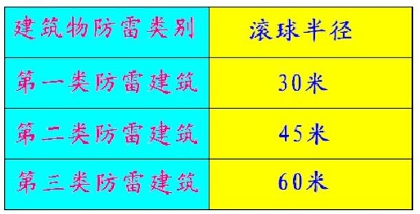 接閃器(避雷針,避雷線,避雷帶,避雷網)的防護范圍一般用滾球法明確定,不同的防雷等級所用的半徑不同,如下圖所示