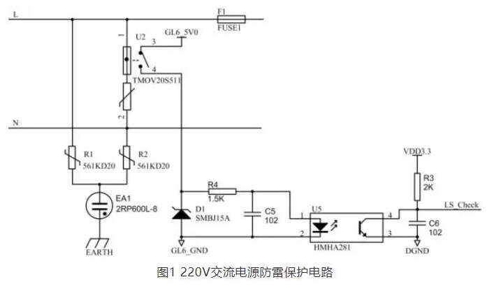 環境動力監控系統中電源采用220V交流電源供電,前端所使用的防雷保護電路詳見圖1。