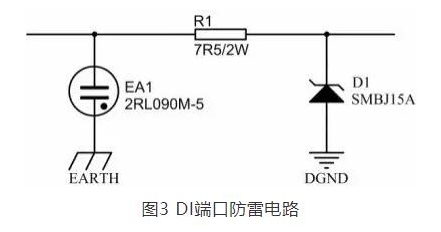 在基站環(huán)境中由于AI/DI輸入端口是通過(guò)長(zhǎng)距離的線纜與傳感器相連,因此AI/DI端口同樣存在防雷保護(hù)問(wèn)題(主要為感應(yīng)雷),在RMS-500系統(tǒng)中我們采用氣體放電管加TVS管組成的兩級(jí)防護(hù)電路,詳見(jiàn)圖3和圖4。