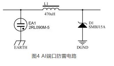 在AI防雷電路中由于需要對(duì)4~20mA電流和電壓進(jìn)行測(cè)量,因此我們?cè)诰确秶鷥?nèi)采用電感L1而沒(méi)有使用電阻,L1應(yīng)滿足L1≥(U1 - U2) × (T2 - T1) / (I1 /2),電感L1的取值計(jì)算方法為:以8/20us沖擊電流為準(zhǔn),測(cè)得在設(shè)計(jì)通流容量下壓敏電阻的殘壓值U1,查T(mén)VS器件手冊(cè)得到8/20us沖擊電流作用下TVS管的最大通流量I1、以及TVS管最高鉗位電壓U2,8/20us沖擊電流的視在波頭時(shí)間T1=8us,視在半峰值時(shí)間T2=20us